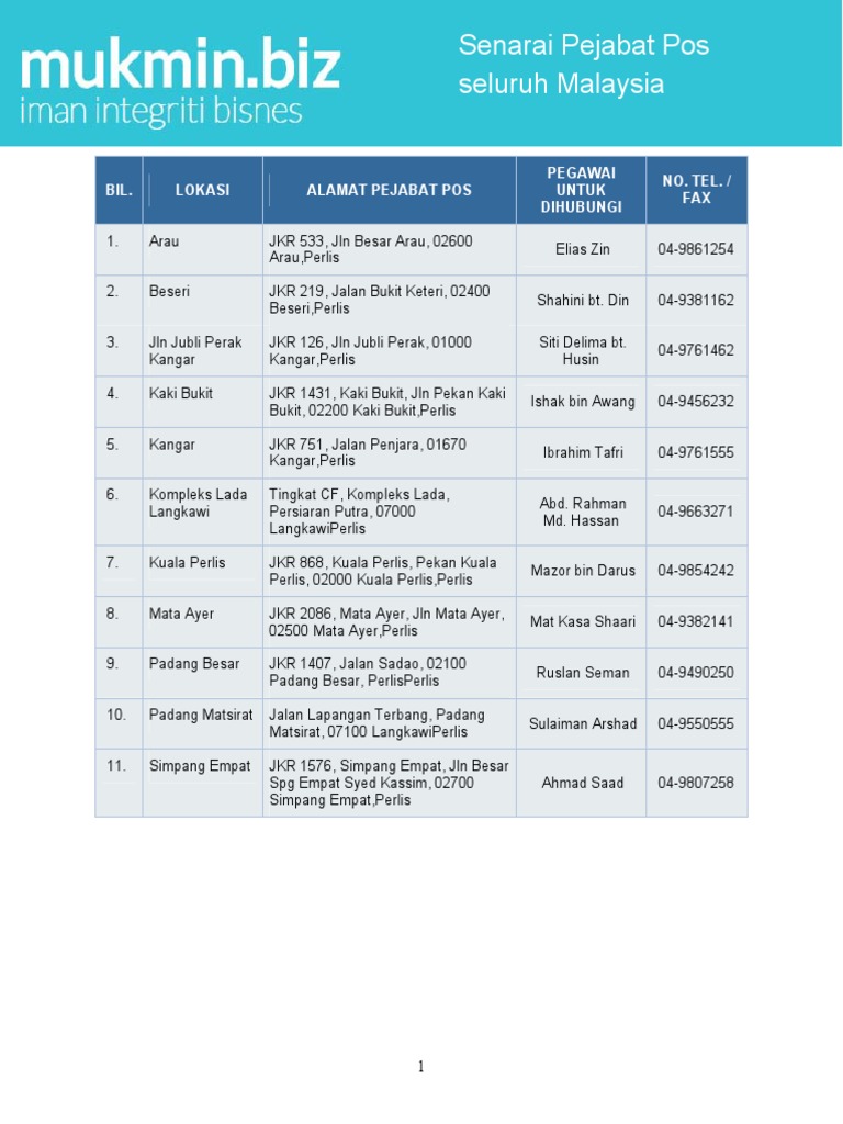 Senarai Alamat No Telefon Pejabat Pos Malaysia