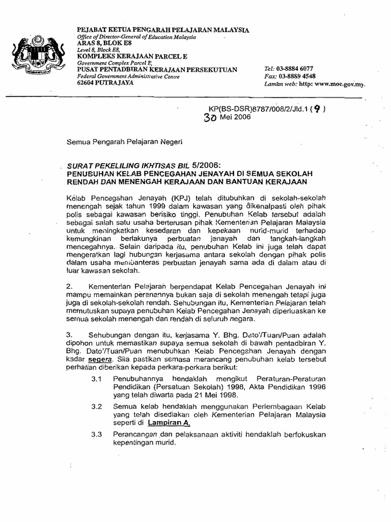 Surat Pekeliling Ikhtisas Bil 5 2006 Penubuhan Kelab Pencegahan Jenayah Di Semua Sekolah Rendah Dan Menengah Kerajaan Dan Bantuan Kerajaan