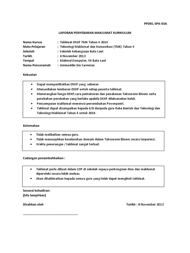 Laporan Penyebaran Maklumat Kurikulum Tmk Tahun 4 Docx Version 2