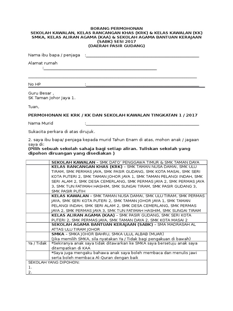Borang Permohonan Sekolah Kawalan