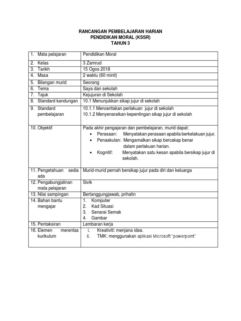 Doc Rancangan Pengajaran Harian Pendidikan Moral Tahun 4 Mem Mm Academia Edu
