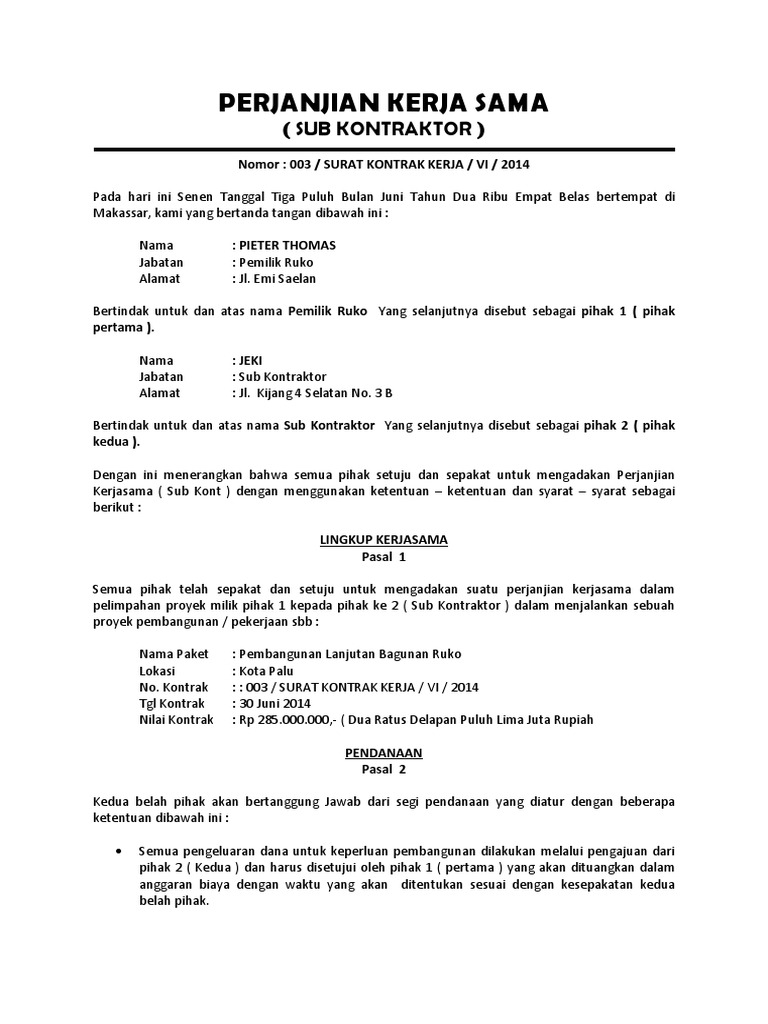 Doc Perjanjian Kerja Sama Sub Kontraktor Dpd Askonas Sulteng Academia Edu