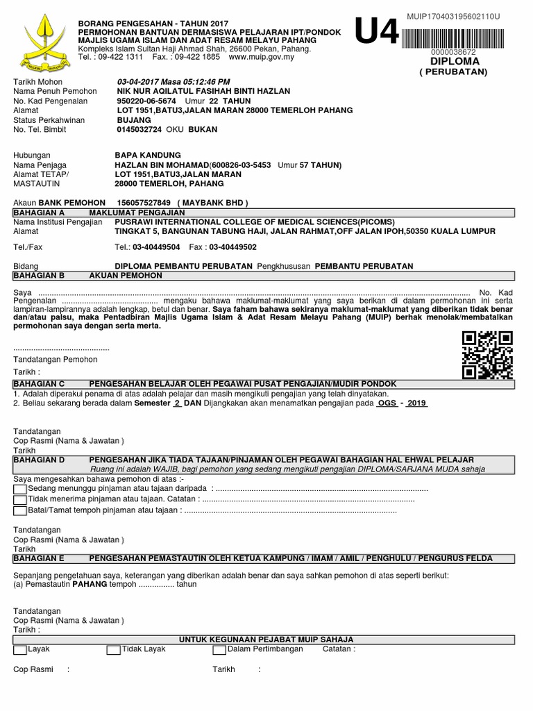 Applicants must be malaysian nationality and islam in religion. Applicants must be born or stay in pahang. Zakat4pengajian adalah merupakan satu inisiatif bagi memudahkan umat islam negeri pahang untuk memohon bantuan zakat dari majlis ugama islam adat resam melayu pahang secara atas talian on line zakat4pengajian ini dapat menyediakan pelbagai jenis bentuk bantuan zakat untuk dimohon oleh pengguna serta lebih mudah untuk menyemak status permohonan.