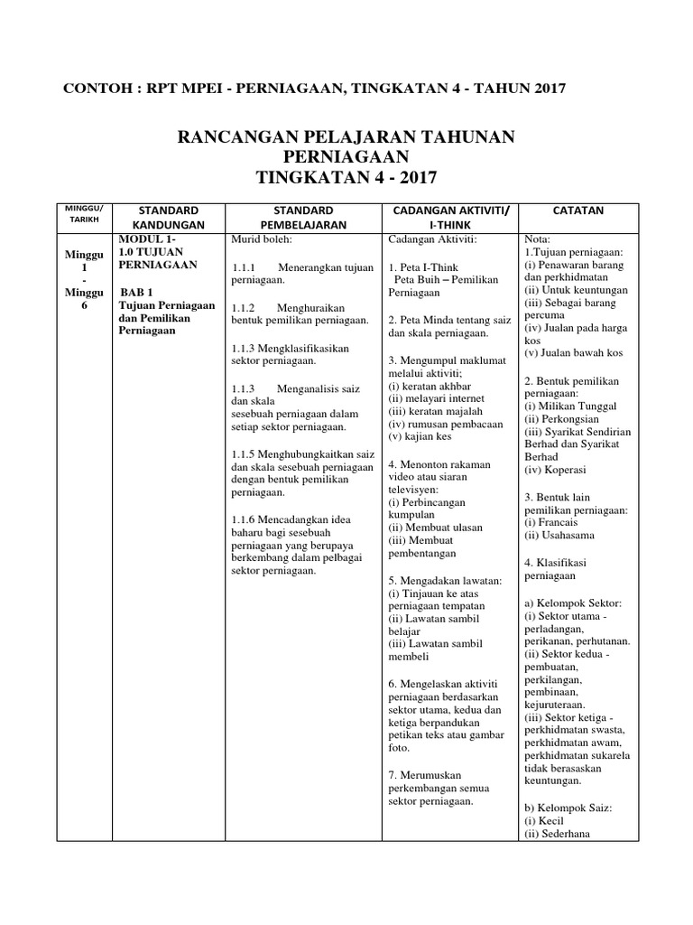 Rancangan Pelajaran Tahunan Perniagaan Tingkatan 4 2017