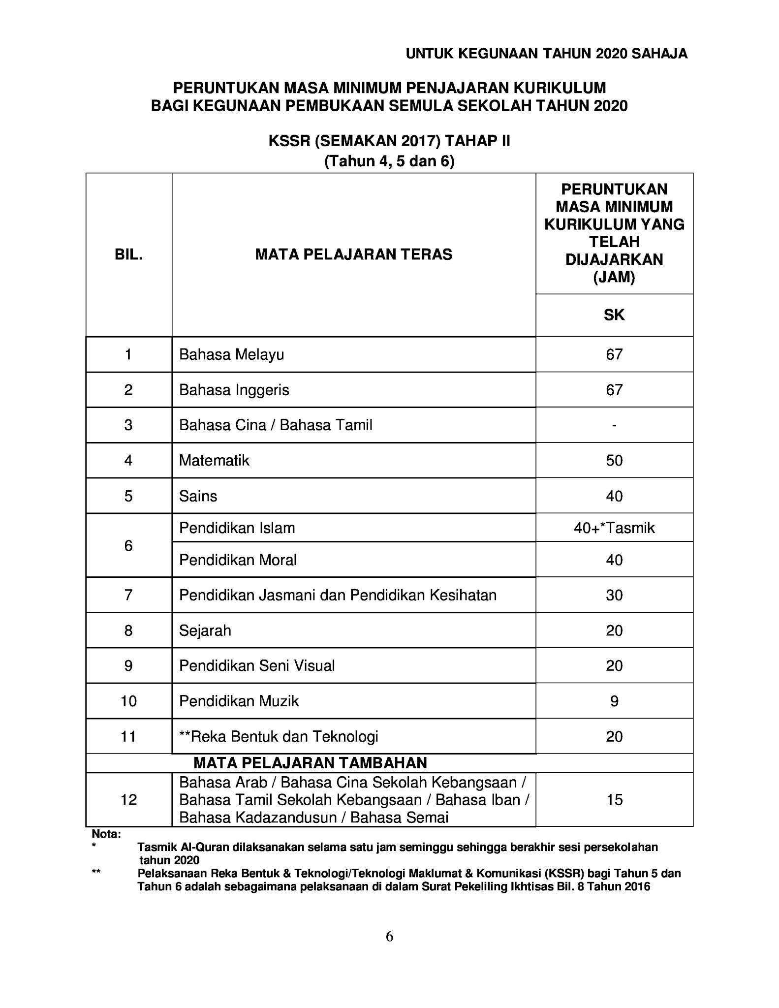 Mata Pelajaran Peruntukan Masa Minimum Jam Setahun Kssr Semakan 2017 Tahun 1 2 3 4 5 6