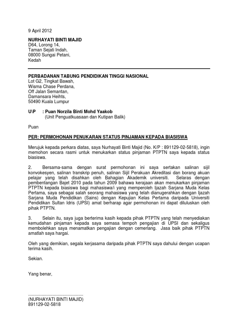 Contoh Surat Rayuan Ptptn Permohonan Pinjaman