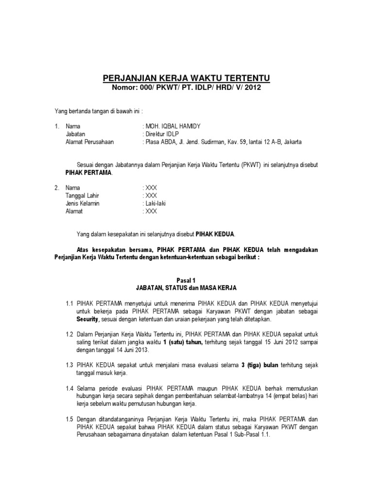 Pkwt Contoh Surat Kontrak Kerja Karyawan